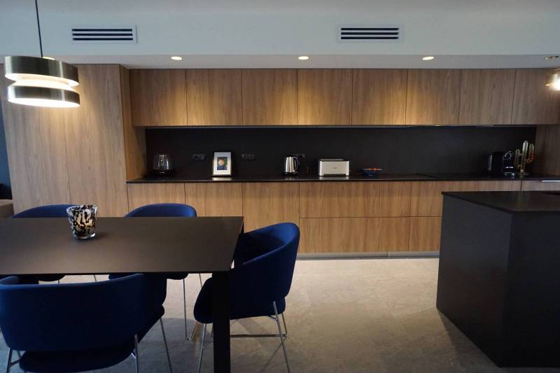 Réalisée à Bordeaux dans le quartier de Caudéran, cette cuisine Cesar modèle Maxima 2.2 est ici réalisée dans la finition stratifié mat décor noyer miel.