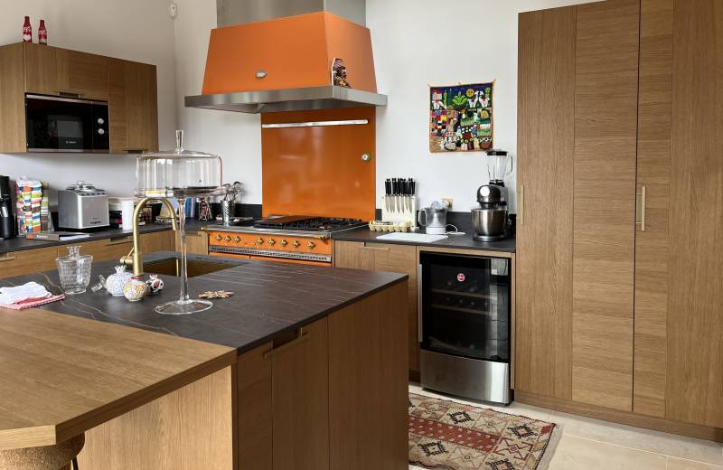 Magnifique cuisine Cesar modèle Intarsio en chêne méditerranéen et plan de travail en Dekton Laurent de 20 mm produits par Cosentino.