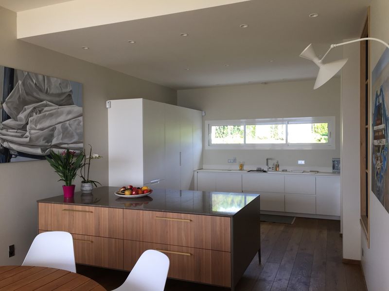 Cette cuisine modèle Maxima 2.2 de chez Cesar a été réalisée en laque finition blanc mat et en placage de noyer avec des plans de travail en marbre et Dekton.