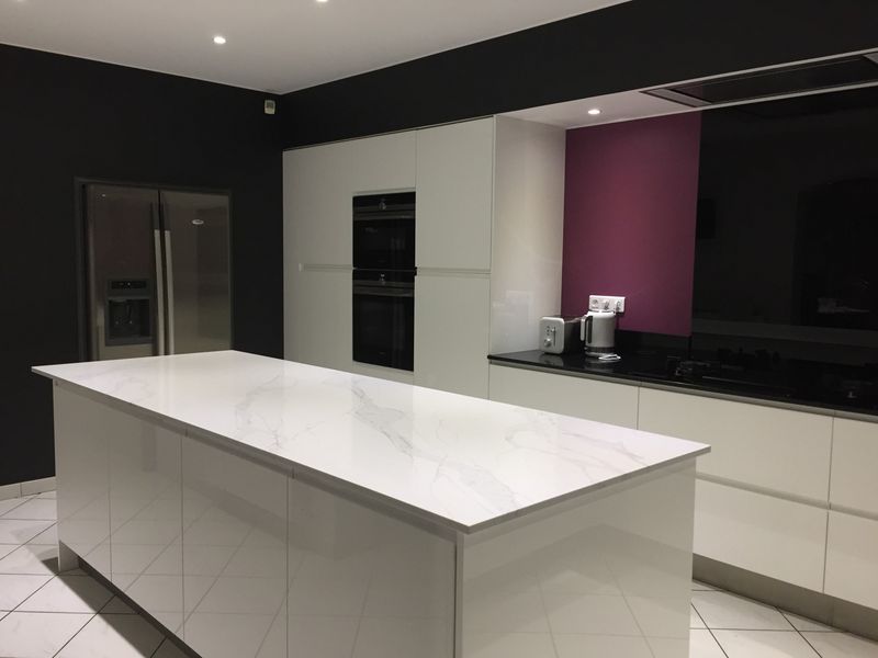 La magnifique cuisine modèle Eclipse laquée blanc brillant de chez Discac est ici présentée avec des plans de travail en granit noir et quartz marbré.