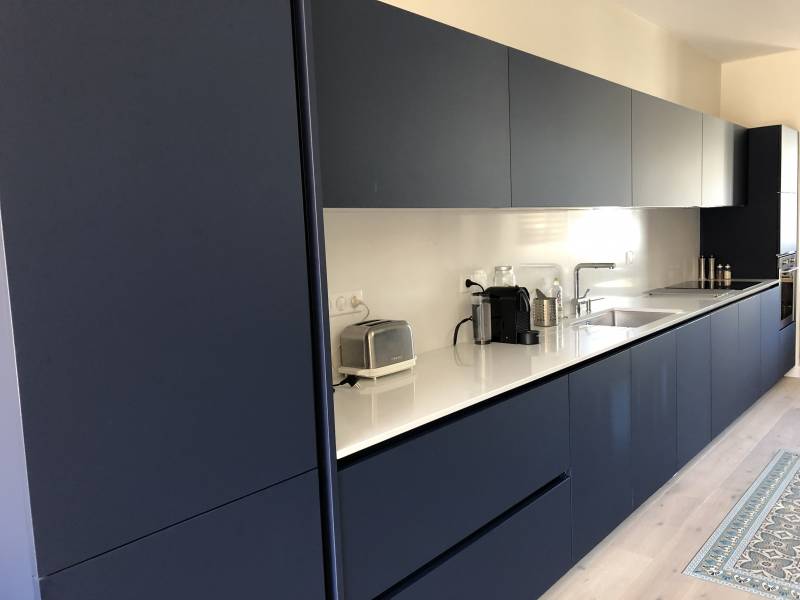 Cette cuisine Cesar modèle Maxima 2.2 est ici réalisée avec des façades revêtues de Fenix bleu Fez.