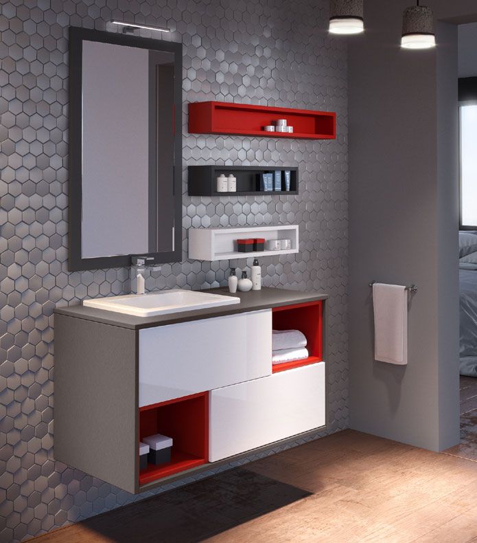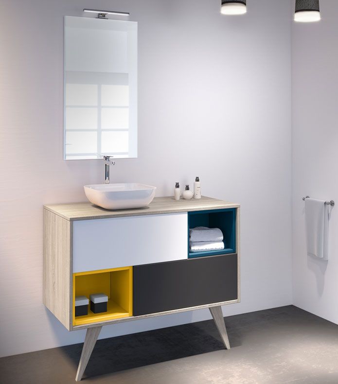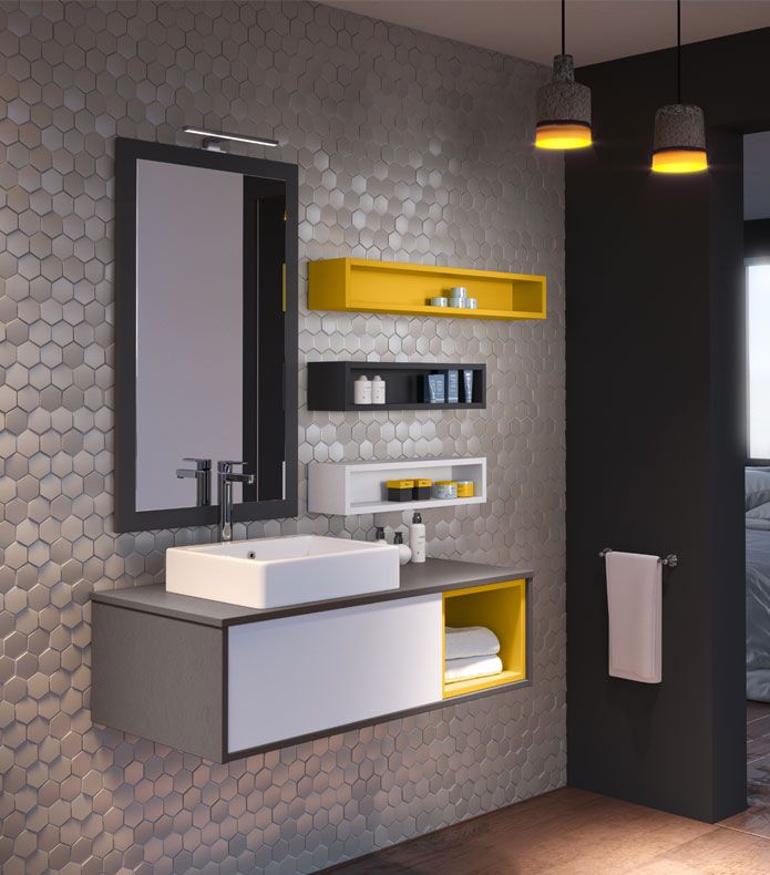 Le modèle Mosaïque est réalisable dans de nombreuses finitions et le concept présenté vous permet de moduler votre mobilier de salle de bains selon vous goûts et vos besoins en rangement.