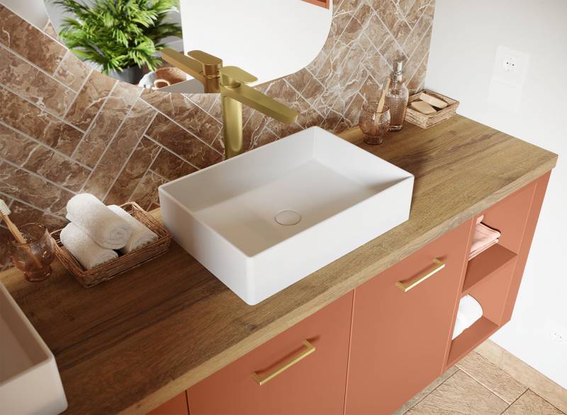 Cette jolie salle de bains de chez Discac est ici présentée en coloris abricot.