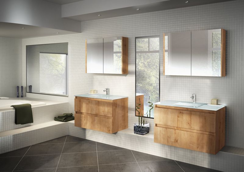 Les salles de bains modèle Rivage sont réalisées avec des portes "passage de main" sans poignée aux lignes épurées.